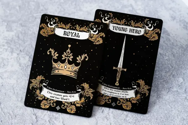 Print on demand for kitchen-table games, playtesting, Cube, and Commander nights. Premium black-core stock, standard sizing, and a finish that shuffles cleanly.
