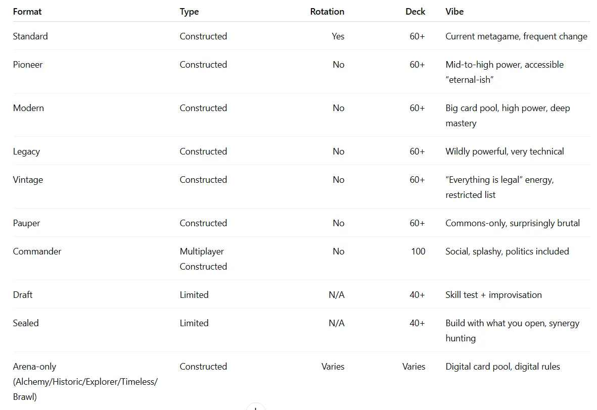 An MTG format is basically a rules wrapper: what sets are legal, how you build your deck, and sometimes how the games are played. Pick the format first, then build the deck. Doing it the other way around is how you end up with a beautiful pile of cardboard that legally belongs to absolutely nowhere.