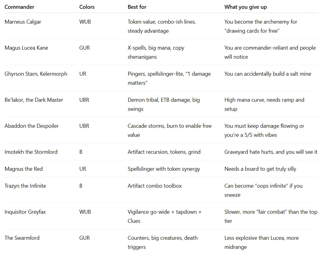 Marneus Calgar is the easiest “strong and straightforward” pick. Make tokens, draw cards, keep playing Magic.