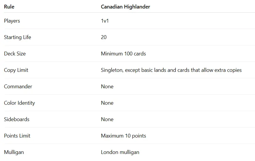 If you want the clean version, this guide explains the Canadian Highlander rules, how the points system works, what makes the format different from Commander, and how to build a first deck that does not immediately fold to the first scary thing your opponent does.
