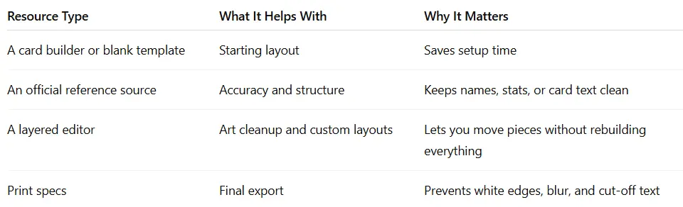 Magic works differently. A sports card is mostly a poster with stats. A Magic card is a rules object. So your best free resources are the ones that help with structure, text, and print readiness.