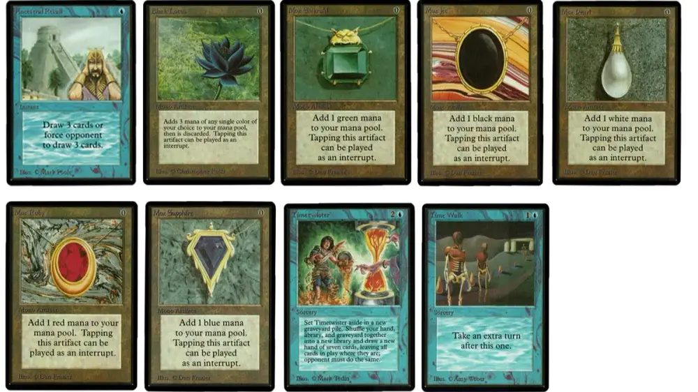 Each card breaks the game in a fundamental way, offering massive amounts of mana, card draw or extra turns. In the early days of MTG these cards redefined what a powerful card meant and set the standard for the best decks.