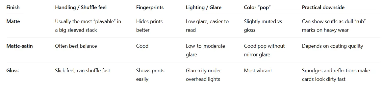 Matte (or matte-satin) is usually the best “real play” choice: less glare, fewer obvious fingerprints, and it feels less sticky in a big sleeved stack.