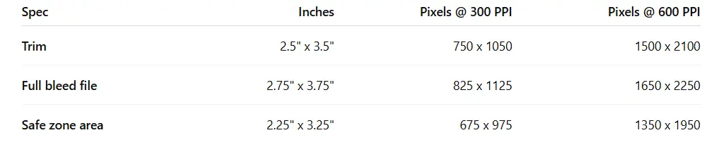 Trim size (final card): 2.5" x 3.5" (aka “poker size”).