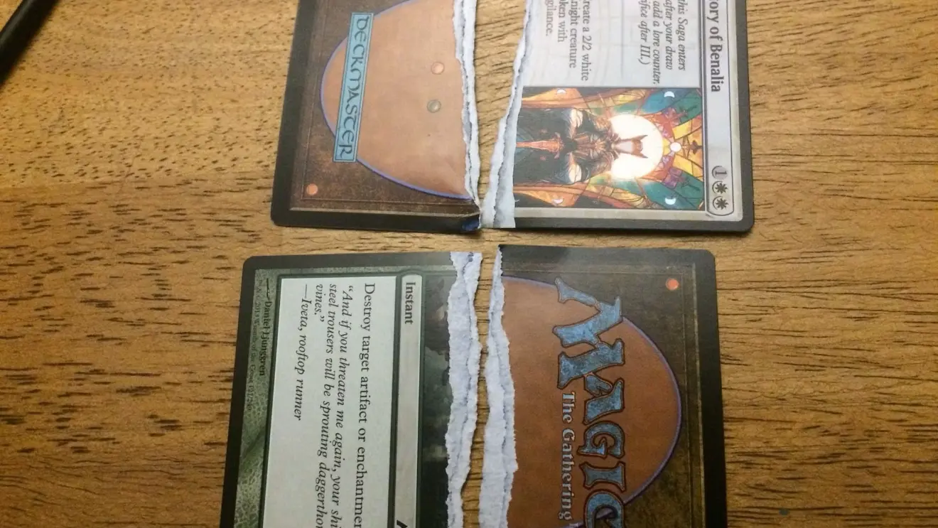 The rip test, as the name suggests, involves tearing the card to look for a blue or black core layer. This is definitive in many cases—real Magic cards usually have that distinct middle layer—but it obviously destroys the card. You wouldn’t want to do this on a potentially high-value card. It’s considered a last resort if you’re certain the card is already worthless or you have multiple copies and want to confirm authenticity. Because it’s destructive, most collectors prefer other tests first. However, if you suspect a fake card, the rip test can be a conclusive method to confirm its authenticity.