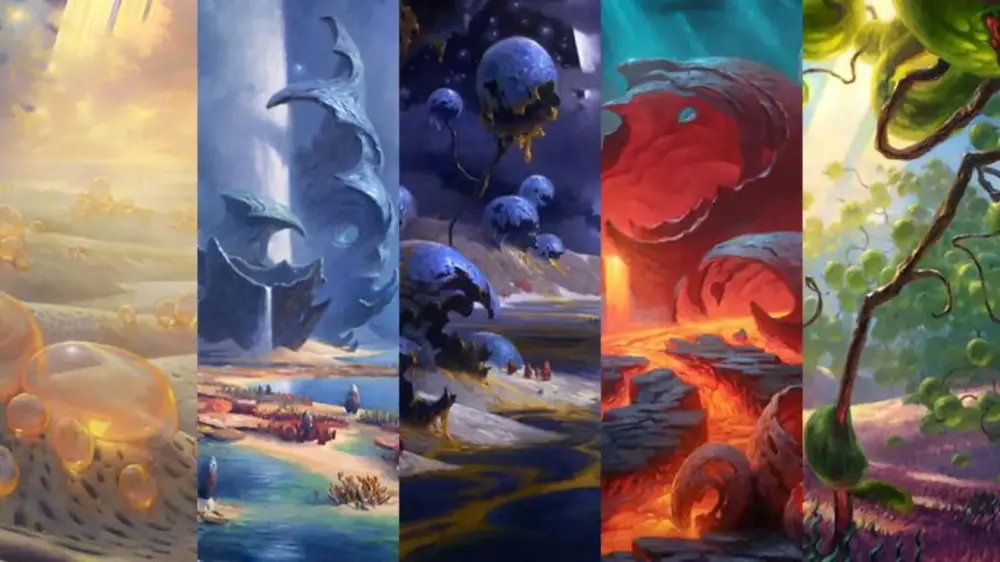 Paquette talked about pulling from classic sci-fi and fantasy influences, including Moebius and Roger Dean, plus a childhood deep cut that shaped how he thinks about alien environments. But the more interesting bit, in my opinion, is the design problem he solved: how do you paint five different planets that still feel like Plains, Island, Swamp, Mountain, and Forest?