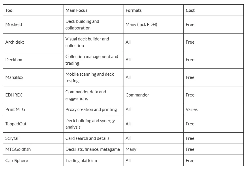 Here’s an overview of Magic: The Gathering tools that help with deck building, collection management, and proxy creation. Each site or app has different features, so pick the ones that fit your style. This list is for both competitive formats and casual play. You can browse, build, and manage your next deck with ease.