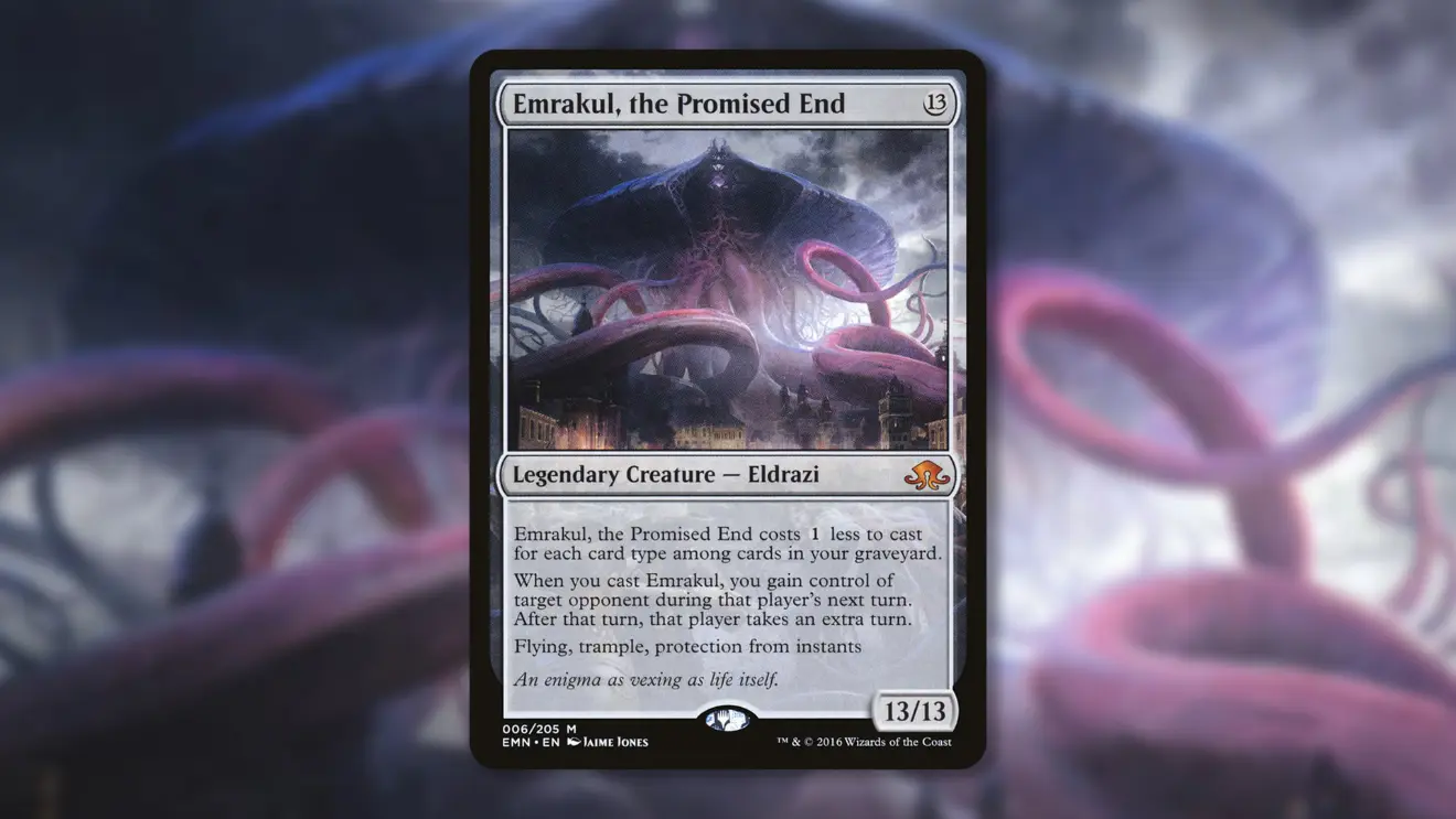 Another 13/13, Emrakul, the Promised End is a colorless Legendary Eldrazi for thirteen mana, costing one mana less for each card type among cards in your graveyard. Complimenting its massive scale, Emrakul, the Promised End has flying, trample, and protection from instants, allowing it to efficiently deal damage and protect itself from instant-based removal.
