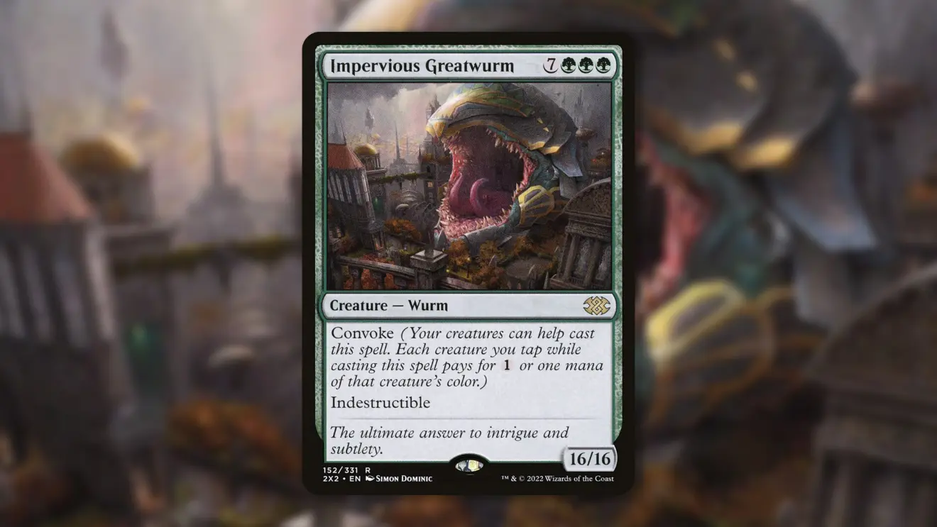 Impervious Greatwurm is a mammoth 16/16 indestructible green Wurm for ten mana. The buy-a-box promo of Guilds of Ravnica, Impervious Greatworm possesses convoke, allowing creatures to be tapped to pay for one mana each when a player is casting the Greatwurm.