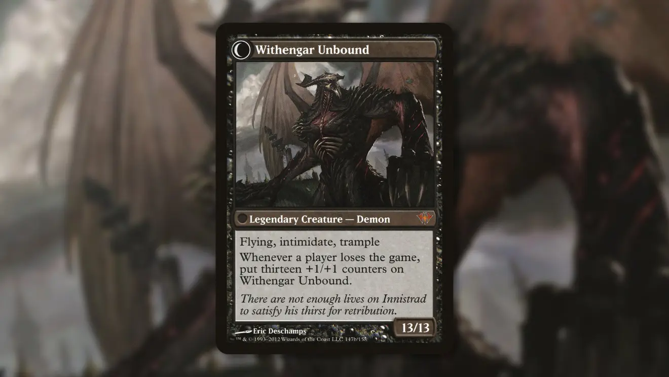 Withengar Unbound is a terrifying and massive 13/13 legendary Demon with flying, intimidate, and trample. Withengar even has an ability that lends it to be used in multiplayer formats like Commander, as when another player loses the game, thirteen +1/+1 counters are put on the Demon.