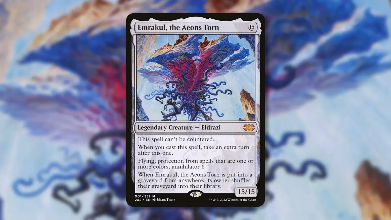 An uncounterable 15/15 with flying, protection from colored spells, and annihilator 6 for fifteen mana, Emrakul allows its controller to take an extra turn after being cast. Between its absurd offensive potential and the extra turn it provides, it is not uncommon for a game to be won shortly after (if not immediately after) Emrakul, the Aeon’s Torn, is cast. It is so powerful that it is one of a small percentage of cards banned in Commander.