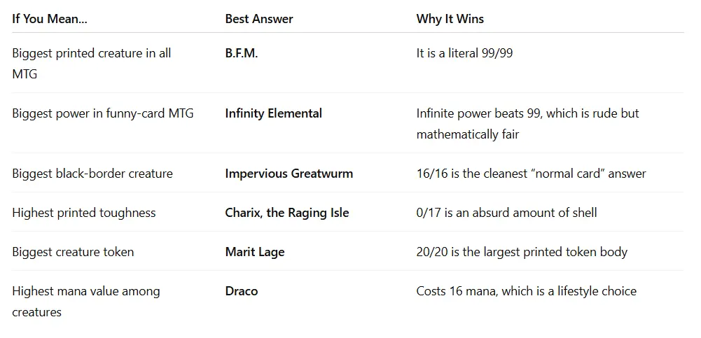 If someone asks, “What’s the biggest creature in MTG?” and you instantly answer “Actually, Infinity Elemental has incalculable power,” you are probably correct. You are also becoming the reason nobody likes trivia night.